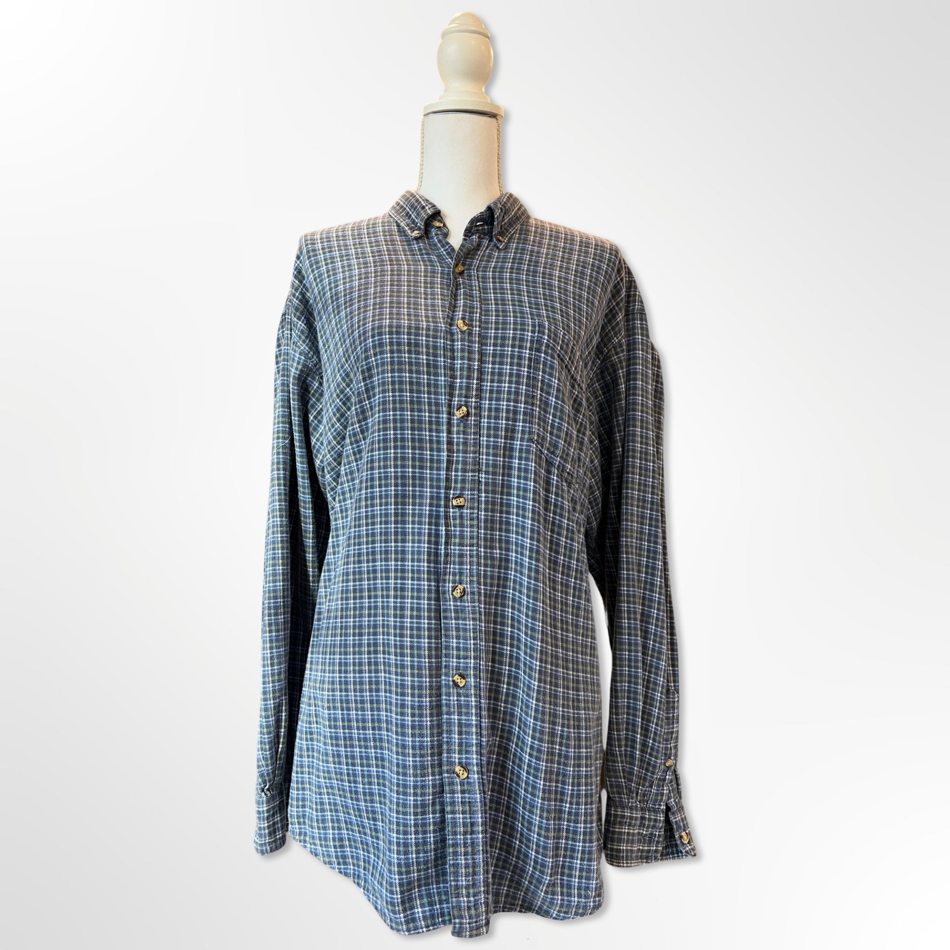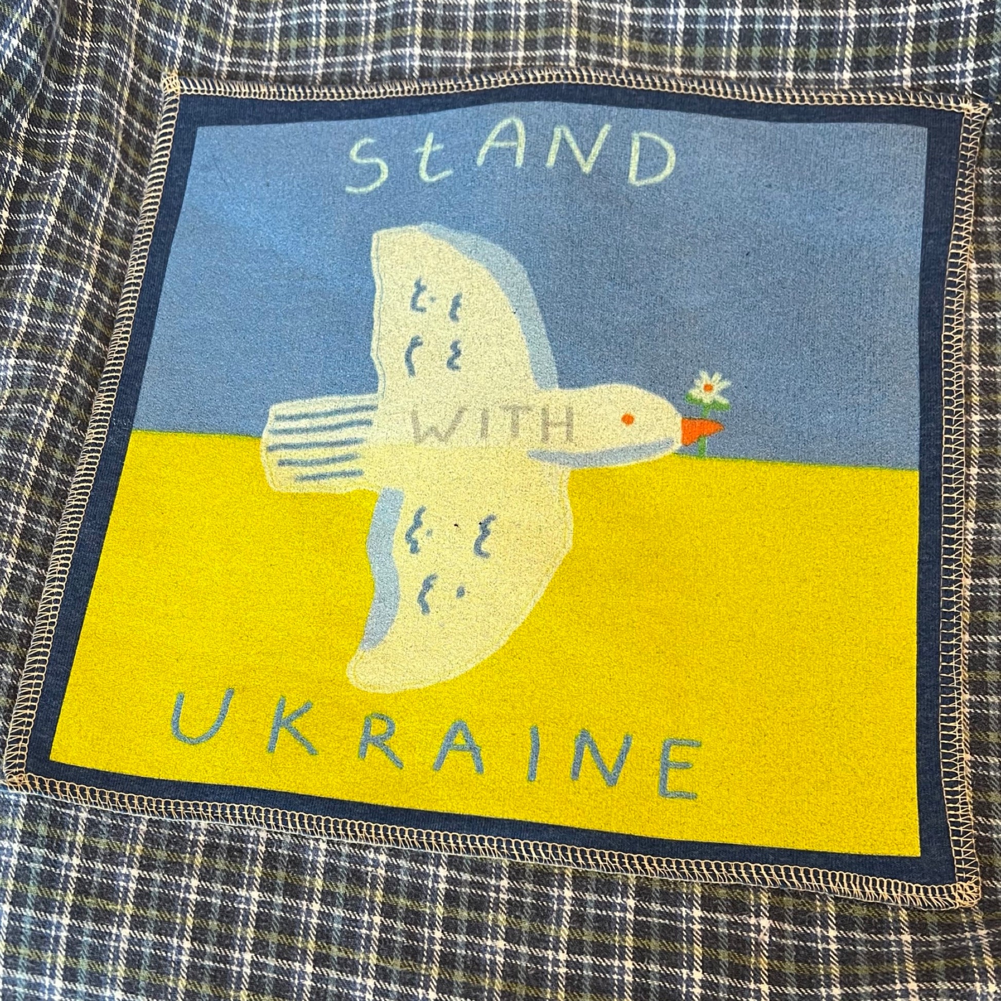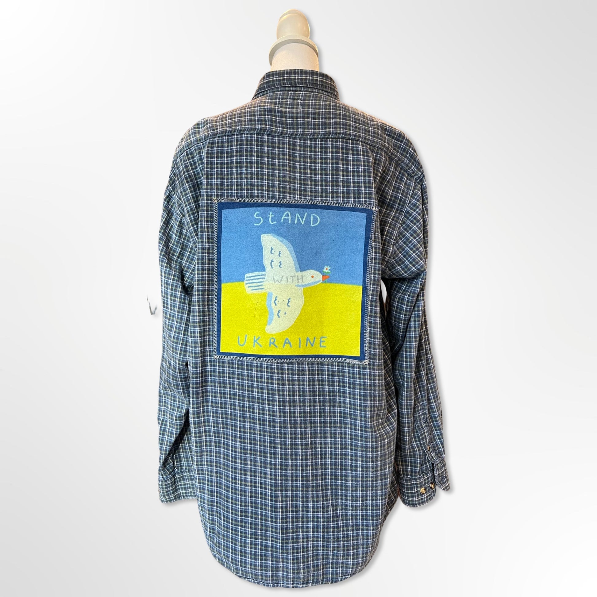 A classic flannel enhanced with Stand with Ukraine patchwork, sourced from a vintage sweatshirt.